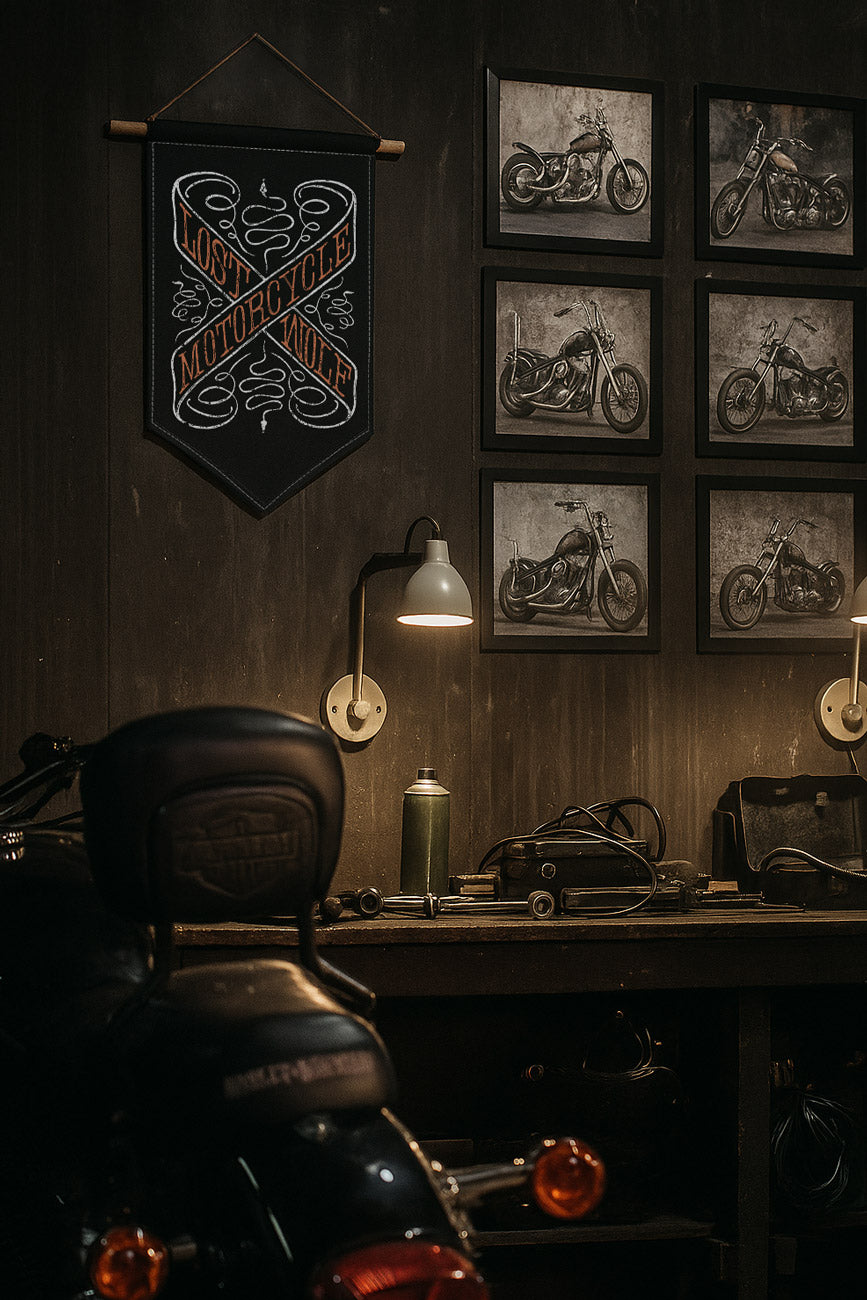 Cuelga tu estandarte motero y decora tu espacio más intransigente.